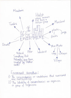 I started my environments project with a very basic and very unoriginal brainstorm! i always do this to get the train of thought moving because i find that certain keywords in my brainstorm become vital to my project,i also wrote down the definition of environment because i thought that it mite explain something different as apposed to just an area of some place, and a key word for me in the definition of environment was SURROUNDINGS because a surrounding can literally be anything, its so vast! but a word that came to mind also while brainstorming was HABITAT.The definition of Habitat is "a type of environment in which an organism or group normally occurs" i think habitat is a great word to look at because it defines what kind of characters (if any) or even plant life (if any) you can have in a certain sought of habitat! Below are some habitats and the organisms that inhabit it.....